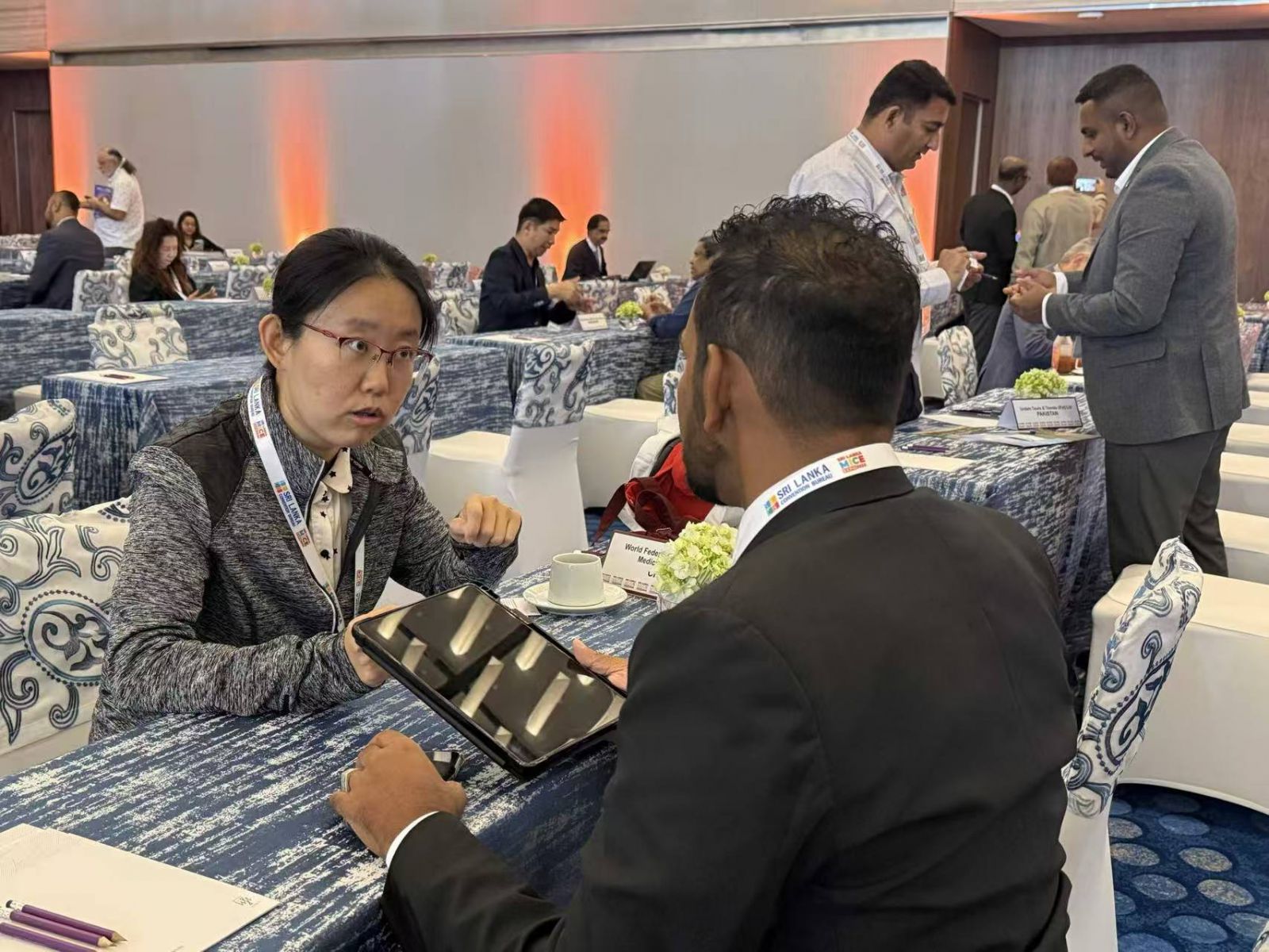 中国买家团代表在2025年斯里兰卡国际会展博览会现场进行商务洽谈。(博悦咨询 供图)