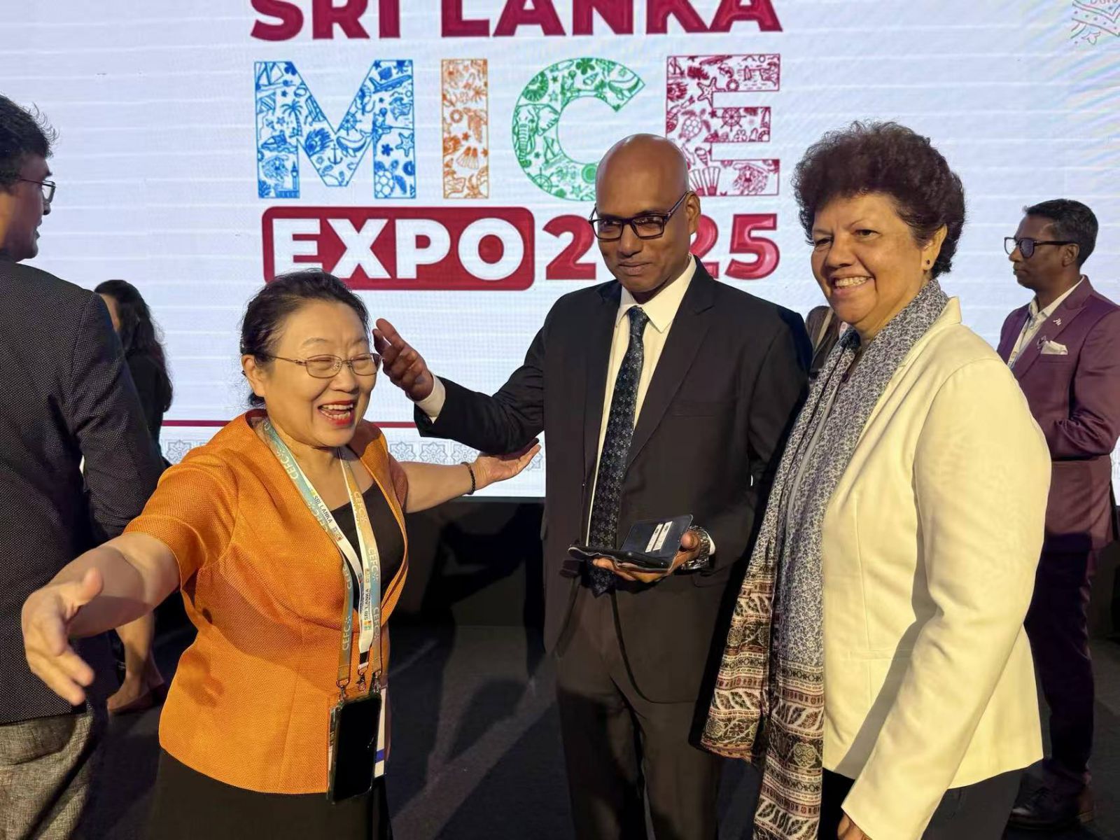 姚红(左)和斯里兰卡会展局负责人在2025年斯里兰卡国际会展博览会开幕式现场。(博悦咨询 供图)
