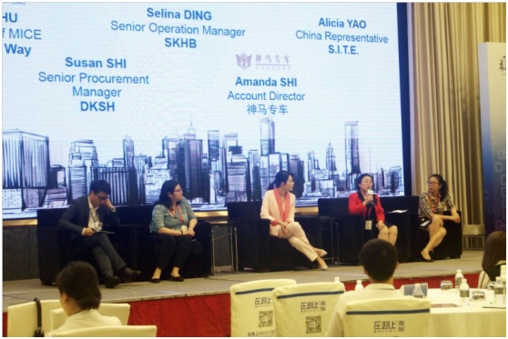 我公司董事总经理姚红还参加了下午的讨论会。该讨论环节由在路上商旅会奖事业部总监朱贝先生主持,科华生物高级运营经理丁晓英女士、DKSH高级采购经理施芸女士、神马专车客户总监Amanda石女士和国际奖励旅游精英协会(SITE)全球理事会理事姚红参与,针对以下话题给予现场嘉宾充分的分享和解答。